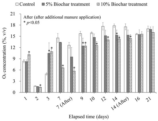 Specifically, adding biochar to the bedded pack can facilitate microbial activity in some regions of the manure, manifesting as an increase in the O2 consumption rate. The O2 concentrations of the treatment groups exhibited a generally lower trend than those in the control over the 21-day experimental period (Figure 3). The tendency of lower O2 concentrations in the treatment groups, which had higher FAS compared to the control, indicates that active decomposition of organic matter by aerobic microorganisms occurred in the treatment groups. Biochar, exhibiting physical properties similar to bulking agents, supports forming a favorable environment for aerobic bacteria to proliferate stably in the bedded pack [].