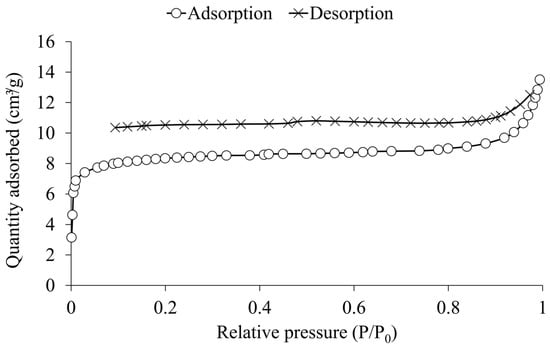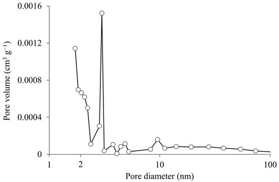 The adsorption-desorption isotherm of rice husk biochar (Figure 4) exhibits characteristics of both Type I (b) and Type IV isotherms, as described by the International Union of Pure and Applied Chemistry (IUPAC) []. The steep initial rise at low relative pressure (P/P0 < 0.01) indicates micropore filling, a hallmark of Type I (b) isotherms, which are associated with micropores, including wider micropores and narrow mesopores (<~2.5 nm). This is supported by the t-plot analysis, which reveals that micropores contribute 26.0 m2 g−1 to the total specific surface area of rice husk biochar, accounting for approximately 82% of the specific surface area measured at 31.9 m2 g−1 (Table 2). The adsorption behavior at higher relative pressures (P/P0 > 0.1) aligns with Type IV isotherms, indicating the presence of mesopores in the rice husk biochar. According to the IUPAC classification, Type IV isotherms are observed in mesoporous materials, where the adsorption process involves monolayer-multilayer adsorption followed by capillary condensation at higher relative pressures.