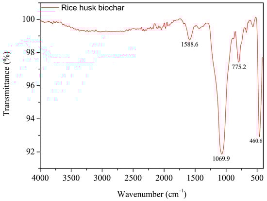The FTIR spectrum of rice husk biochar exhibited peaks at 1588.1 ± 0.2 cm−1, 1047.8 ± 19.0 cm−1, 791.2 ± 3.9 cm−1, and 459.9 ± 2.4 cm−1 (Figure 6). The peak at 1588.1 cm−1 corresponds to C=O stretching vibrations, with potential contributions from C=C or aromatic ring vibrations [,,]. The peak at 1047.8 cm−1 is associated with Si-O-Si stretching vibrations [,,]. The peak at 791.2 cm−1 is attributed to Si-H stretching vibrations but could also be linked to C-H bonds [,]. Lastly, the peak at 459.9 cm−1 represents Si-H bending vibrations, consistent with previous studies [].