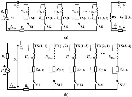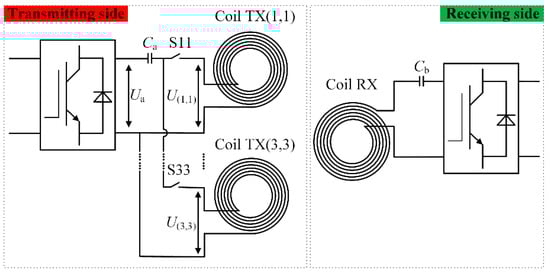 The array UWPT system adopts the S-S compensation network topology, and its simplified circuit diagram is shown in Figure 2. The system includes a high frequency inverter and rectifier, compensation capacitors Ca and Cb, switch S11 to S33, transmitting array coil TX(1, 1) to TX(3, 3), and receiving coil RX. In the process of power transmission, the optimal power supply coil switch is closed by determining the position of the receiver, so that the power supply coil is connected to the compensation capacitor and the inverter; the other array coils are in the open circuit state.