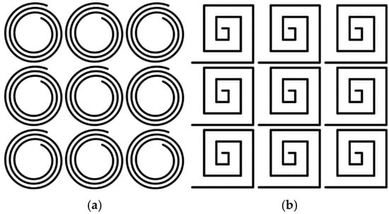 Planar coil structure. (a) Circular spiral structure coil. (b) Square spiral structure coil.