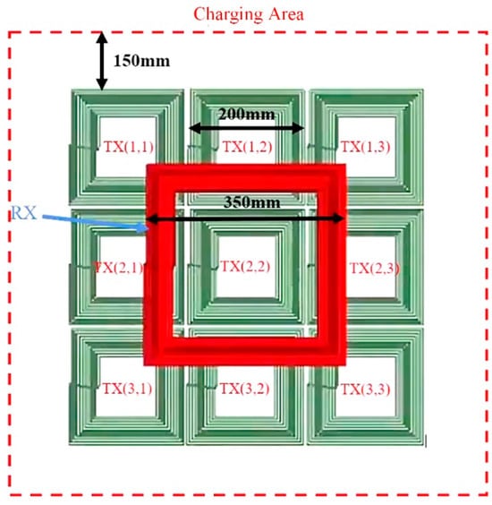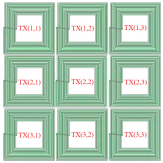 The arrangement of the transmitting array mainly has two kinds of interval arrangement and close arrangement. The interval arrangement means that there is a certain gap between the transmitting array coils, which is mainly suitable for the simultaneous power supply of multiple transmitting coils, which can reduce the coupling degree between the transmitting coils. Tight arrangement means that the transmitting array coils are densely arranged, and there is no gap between the coils, which is mainly suitable for single transmitting coil power supply. While this paper employs a one-to-one single transmitting coil power supply strategy (avoiding simultaneous multi-coil activation), electromagnetic coupling between adjacent transmitting coils (denoted MTX) still exists. This coupling is explicitly considered in the subsequent analysis and does not compromise the single-coil power supply logic, as unpowered coils remain open-circuited. So, the arrangement of the transmitting array coils in this paper adopts a close arrangement. The transmitting array coil group is composed of nine transmitting coils. According to the position of each transmitting coil, the transmitting array coil is labeled as TX(x, y), where x and y represent the horizontal and vertical coordinates of the transmitting array coil, and the value range is [,].