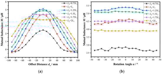 The variation curve of mutual inductance with coil offset. (a) Transverse displacement. (b) Rotational displacement.