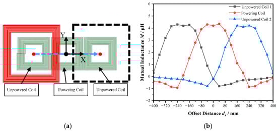 When the receiving coil is laterally offset relative to the power supply coil, the offset trajectory of the receiving coil and the mutual inductance change curve are shown in Figure 9. It can be seen from the diagram that when the receiving coil gradually moves away from the current power supply coil and is close to the adjacent unpowered coil, the mutual inductance between the power supply coil and it gradually decreases, while the mutual inductance between the unpowered coil and it gradually increases. When moving to a certain position, the two are equal. As the receiving coil continues to move, the mutual inductance between the unpowered coil and it is greater than the mutual inductance between the power supply coil and it. According to the change law of mutual inductance, it can be seen that by comparing the mutual inductance between the power supply coil and the receiving coil and the mutual inductance between the unpowered coil and the receiving coil, the position of the receiving coil can be estimated; that is, the receiving coil is above the transmitting coil with the largest mutual inductance value. Using the same method, it can be verified that when the receiving coil has longitudinal displacement and rotational offset, the position of the receiving coil can be estimated by comparing the mutual inductance values, so as to perform optimal transmitting coil switching control.