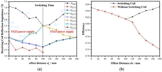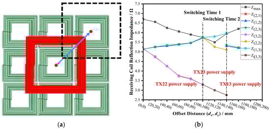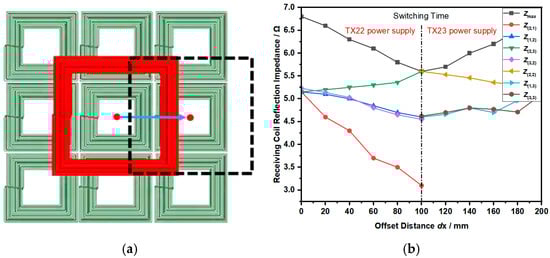 It can be seen from Figure 11 that the transmitting coil TX(2, 2) is powered at the beginning, and Zmax = Z(2, 2) at this time, while Z(2, 2) gradually decreases with the RX offset. When the transverse displacement distance dx = 100 mm, Zmax = Z(2, 2) = Z(2, 3). As the transverse displacement distance dx continues to increase, Z(2, 3) > Z(2, 2). At this time, Zmax = Z(2, 3), the receiving coil is offset above the transmitting coil TX(2, 3), and the transmitting array is switched to the transmitting coil TX(2, 3) for power supply. After that, dx continues to increase, and Zmax is always equal to Z(2, 3), without switching the power supply coil.
