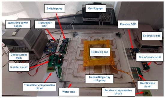 Figure 13 shows the experimental platform of the array UWPT system. The main circuit consists of a DC power supply, inverter circuit, compensation network, switch group, coupling mechanism, rectifier circuit, DC-DC conversion circuit, and load. The transmitter control system is composed of a drive circuit, sampling circuit, multiplication phase detection circuit, and controller DSP28335. The receiver control system consists of a sampling circuit, drive circuit, and controller DSP28335.