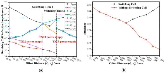 When the receiving coil RX is shifted laterally from the top of the transmitting coil TX(2, 2) to the top of the TX(2, 3), the experimental results of the reflection impedance of the receiving end and the transmission efficiency of the system are shown in Figure 14.