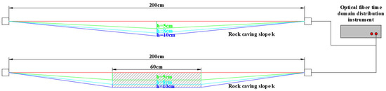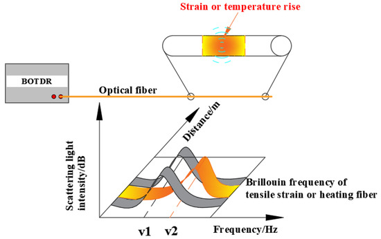 Brillouin optical time-domain reflectometry (BOTDR) is a single-ended optical fiber sensing technology that does not require the formation of a closed-loop circuit for measurement. As illustrated in Figure 1, The frequency shift has a linear relationship with temperature or axial strain changes in the optical fiber. The frequency shift is obtained, and the change of temperature and strain along the whole distributed sensing is measured from the spontaneous Brillouin scattering light [27]. Thus, in this experiment, variations in the Brillouin frequency shift of the optical fiber sensor were monitored to assess changes in strain and temperature within the rock strata.