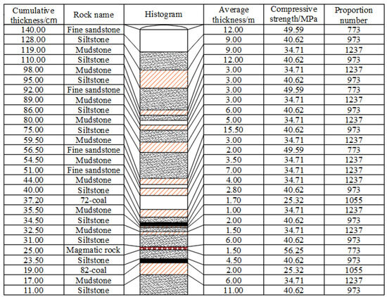 The 7242 working face is the first mining face of the 72-coal seam in the 82 mining area of the Suntuan Coal Mine, Huainan Mining Group. The roadway elevation of the 7242 working face ranges from −424.3 m to −546.9 m. The panel has a strike length of approximately 458–460 m and an inclined width of 248–250 m, with the 8242 working face located beneath it. According to geological data, the thickness of the 72-coal seam varies between 1.04 m and 2.36 m, with an average thickness of 1.7 m. The coal seam is black, ranging from powdery to flaky in texture, with well-developed endogenous fractures. It is classified as semi-bright coal, with localized interlayers of mudstone up to 0.1 m in thickness. The No. 82 coal seam has a thickness between 1.78 m and 2.07 m, averaging 2 m. It is predominantly black and powdery, mainly composed of dark coal, with a semi-dark and semi-bright texture. Figure 2 presents the comprehensive stratigraphic column and parameters of the working face.