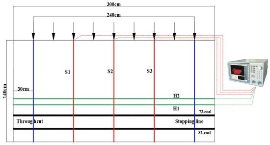 As illustrated in Figure 3, prior to the placement of similar materials, a certain pre-tension is applied to both ends of the optical fibers to ensure they remain taut throughout the experiment. A total of five optical fibers are embedded in the model. Two horizontal optical fibers, designated as H1 and H2, are positioned at 10 m and 30 m above the 72-coal seam to monitor roof displacement and collapse behavior. Three vertical optical fibers, labeled S1, S2, and S3, are placed at 60 m, 120 m, and 180 m from the cut-through to measure the height of overburden failure.