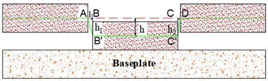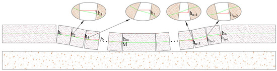As shown in Figure 6, the composite collapse of overlying strata can be obtained from the above analysis. When the overlying strata are broken and collapsed, a hinge is formed between the rock mass and the rock mass, and the differential approximation is regarded as a triangle. Therefore, the displacement hn of point n can be accumulated by the displacement before point n. The positive and negative slope ki of each point represents the increase or decrease of the collapse displacement of the surrounding rock. Then, the displacement hn of point n is expressed as follows: