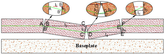 Similarly, the length of BC is l2, CC′ is the displacement h2, and the strain of B′C′ is ε2. At this time, the total displacement of the fiber is hC = h1 + h2, and the displacement variation h2 can be obtained from the above formula: