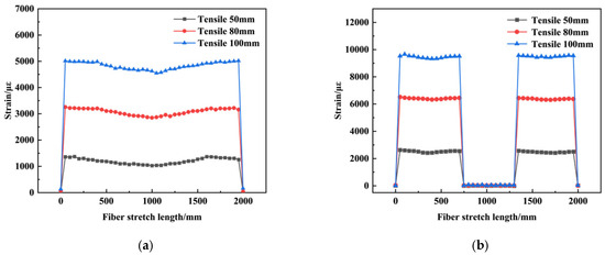 The fiber was stretched by 50 mm, 80 mm, and 100 mm at the midpoint position according to Schemes 1 and 2, and the corresponding strain curves were obtained, as shown in Figure 8. The overall fiber strain curve exhibits a slightly higher strain at both ends and a lower strain in the middle.