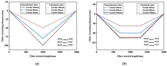 Substituting the optical fiber strain curves into Equation (13), the displacement of the optical fiber at different tensile distances is calculated based on strain variations. The computed fiber displacement is then compared with the theoretical tensile length, as shown in Figure 9.