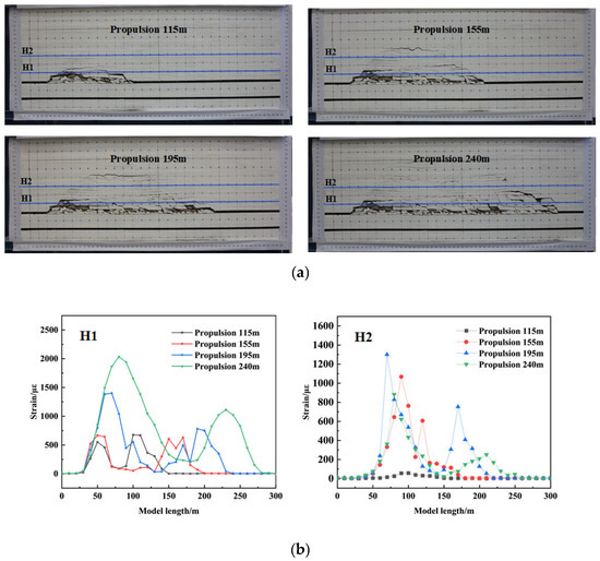 As shown in Figure 10b, at 115 m and 155 m of working face advancement, the strain in optical fibers H1 and H2 remains relatively low, indicating that the roof has not yet experienced large-scale failure. The strain curves exhibit a relatively smooth double-peak pattern, with slightly higher strain values at both ends and lower values in the middle, forming a ‘saddle-shaped’ distribution. Experimental images confirm that, at this stage, the rock mass mainly develops localized fractures and small-scale collapses without significant structural instability. The left peak is primarily concentrated within the 0–50 m range from the boundary coal pillar, indicating that this area is significantly affected by stress concentration, leading to active rock failure. Meanwhile, the right peak shifts forward as the working face advances, suggesting that the rock failure zone continues to expand.