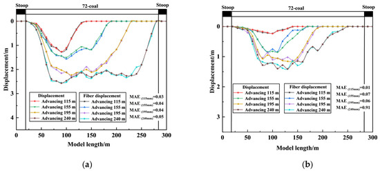 Overall, the collapse displacement values calculated from fiber strain closely match the actual measured data, validating the feasibility and accuracy of this monitoring method. The use of optical fiber strain data to compute displacement enables a more detailed understanding of overlying rock collapse mechanisms, providing reliable data support for roof stability assessments in coal seam mining. Furthermore, this study reinforces the scientific validity and engineering applicability of optical fiber strain theory in mining monitoring, aiding in the prediction of goaf collapse evolution trends and enhancing mine safety management.