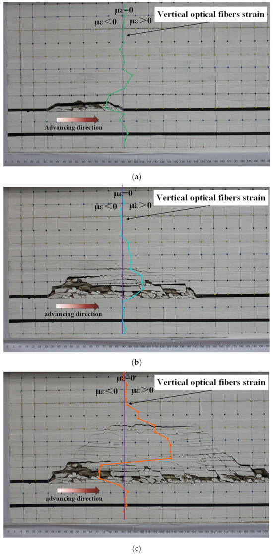 Stage 3 (fiber positioned after the working face has passed): As the working face moves away, the characteristics of the overlying rock collapse change. The goaf rock mass enters the stages of fracturing, collapse, and compaction. In the vertical direction, the rock mass within 0–100 m of the goaf has fully collapsed and entered a stable compaction state, whereas rock beyond 100 m is still in the early stages of fracturing and collapse. Consequently, the optical fiber strain curve exhibits alternating positive and negative variations (as shown in Figure 12c). This indicates that optical fiber monitoring not only captures the failure process of the rock mass but also reveals the stress evolution characteristics at different excavation stages.