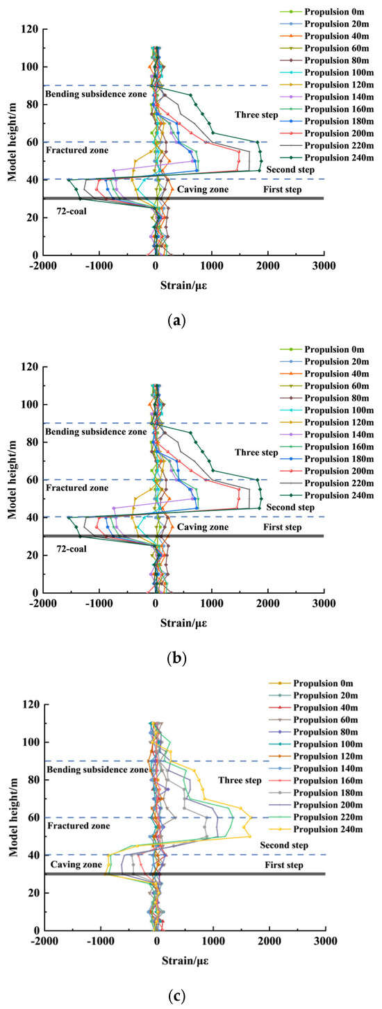 At 140–240 m Advancement: The strain curve further refines into three stepped regions, corresponding to the caving zone, fracture zone, and bending subsidence zone. First step (0–10 m): The strain stabilizes at 870 με, indicating a fully developed caving zone where compressive strain dominates. Third step (40–60 m): Corresponding to the bending subsidence zone, where strain values gradually decrease, indicating that the rock maintains continuity and integrity under bending deformation.