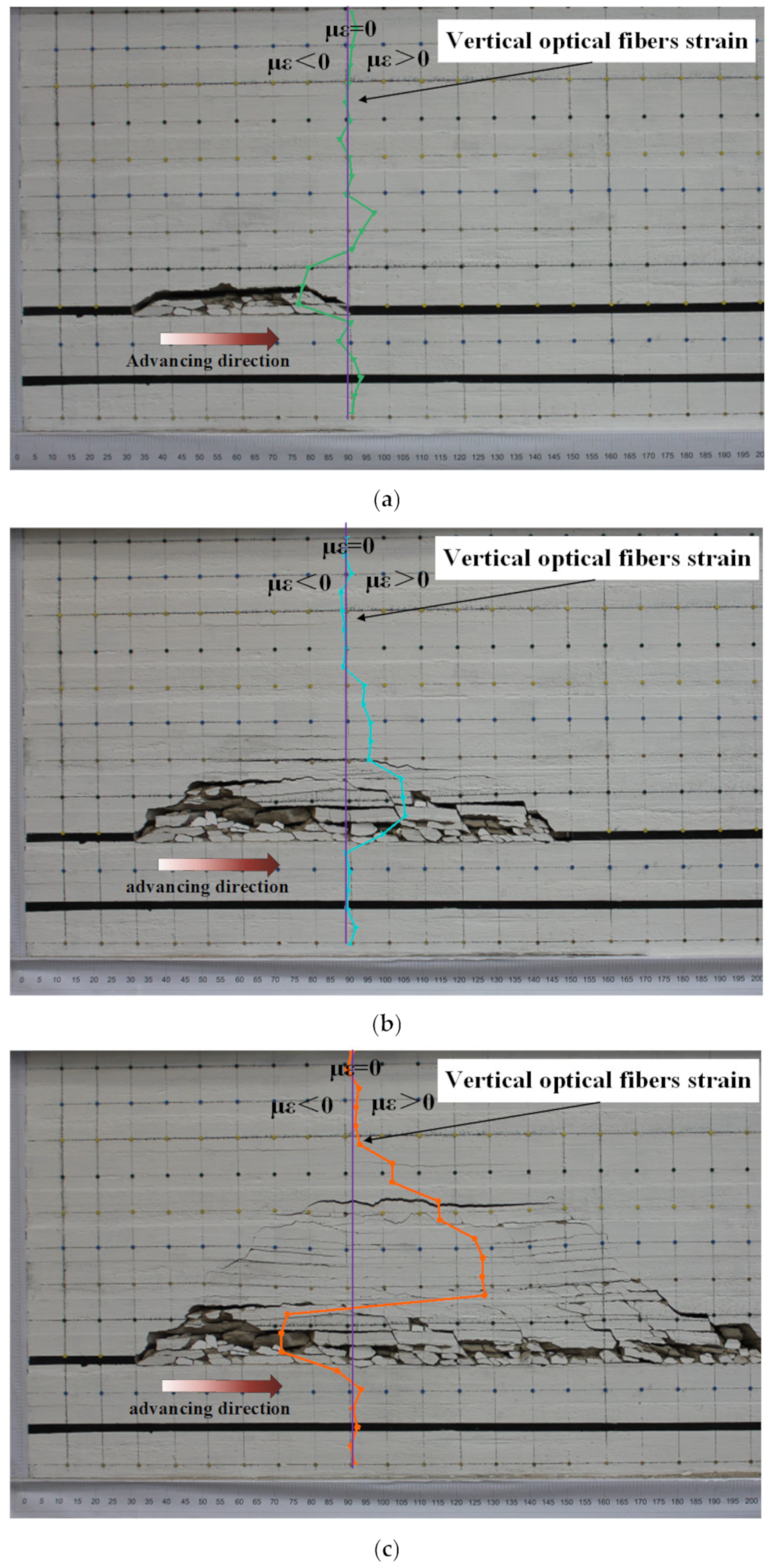 Stage 1 (Before reaching the fiber position): Before the working face reaches the fiber, the surrounding rock mass remains intact, with no visible fractures. However, due to stress redistribution caused by coal seam extraction, the optical fiber records compressive strain, which stabilizes once the pressure reaches a threshold (as shown in Figure 12a). This indicates that in this initial stage, the overlying rock can still withstand mining-induced stress, and the structure remains undamaged.