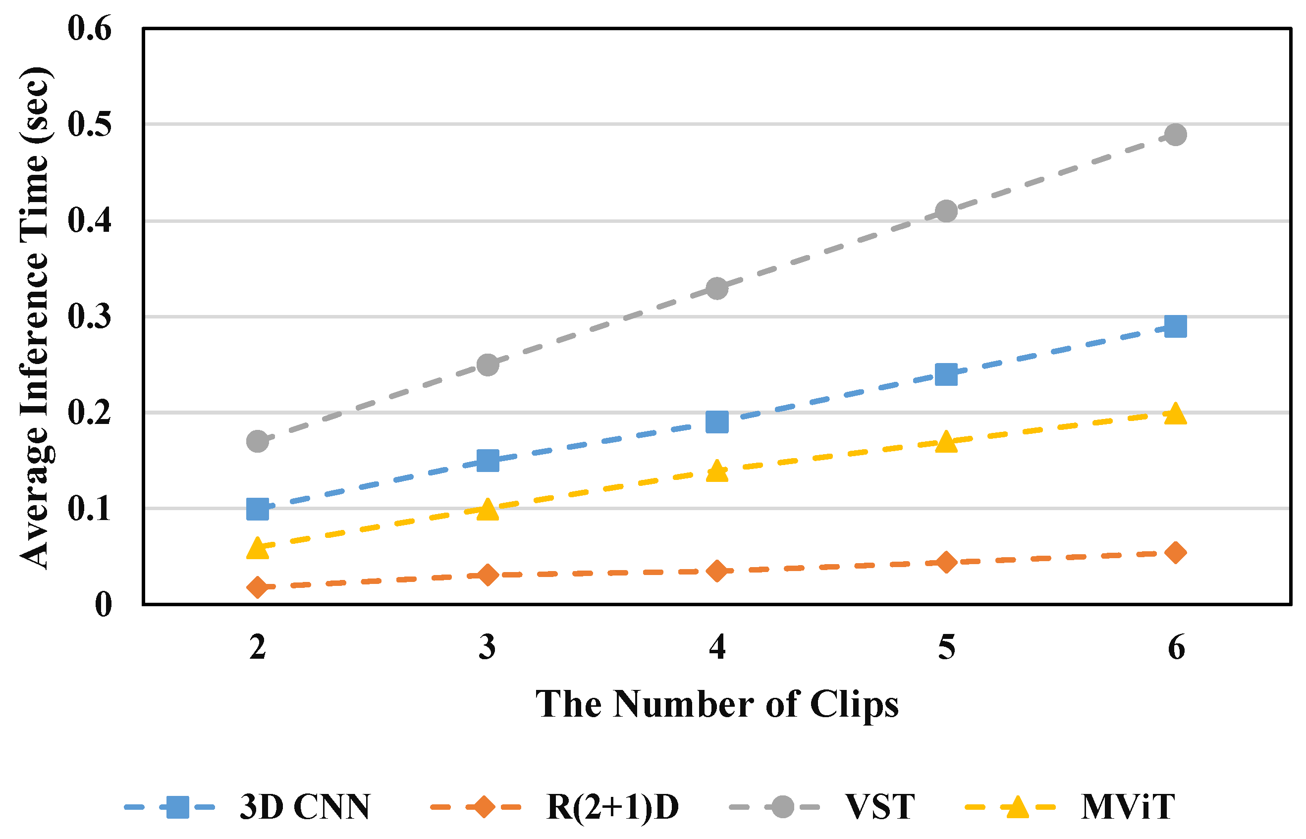 Figure 3, when examining the average accuracy and average inference time for each model at different clip sizes, we observe that, as the clip size increases, the average accuracy generally improves. However, this comes at the cost of increased average inference time. The VST model, while achieving the highest average accuracy, has the slowest average inference time, especially for larger clip sizes. In contrast, the MViT model maintains competitive average accuracy while having a lower average inference time compared to the other models.