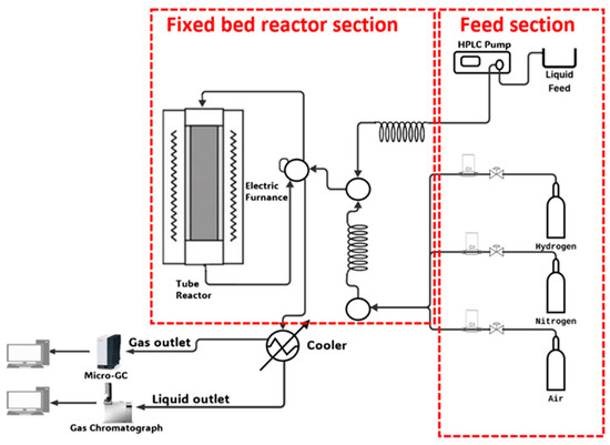 The AAOSR reactions (P= 1 atm, T = 400–700 °C) were carried out on a MICROACTIVITY-PRO unit (PID Eng&Tech. S.L., Alcobendas, Madrid, Spain), whose schematic diagram can be found elsewhere [25]. Co/xCeO2-SBA-15 catalysts (300 mg) were loaded inside the reactor and with an in situ reduction by pure hydrogen flow (30 mL/min) for 30 min at 600 °C before the reaction. After the catalyst activation, a pure nitrogen stream was fed into the reactor until the reaction conditions were reached. A Gilson 307 piston pump (Gilson, Middleton, WI, USA) was used to feed the acetic acid aqueous solution to the reactor (steam-to-carbon molar ratio = 2) at a WHSV of 30.2 h−1 (WHSV was defined as the mass flow rate of reactants—acetic acid, water, oxygen, and nitrogen—divided by the mass of the loaded catalyst in the reactor). The O2 supply was set to operate with an O2/C molar ratio of 0.0375, maintaining the nitrogen/oxygen mixture’s total flow at 60 mL/min. Condensable reaction vapors were condensed at 4 °C, collected, and subsequently analyzed on an Agilent 7820A GC System (Agilent, Santa Clara, CA, USA) while the non-condensable gaseous stream was analyzed in line on an Agilent MicroGC 490 (Agilent, Santa Clara, CA, USA). The mean value of three measurements of each gas sample was used. Figure 1 shows a simplified schematic of the Microactivity—Pro unit, focusing on the feed section, reaction section, and product analyses.