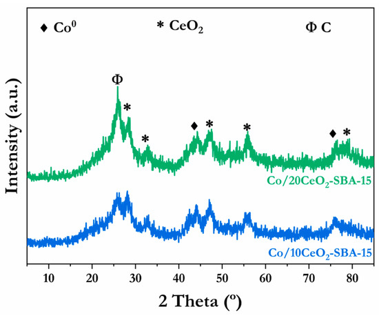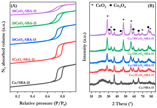 The active phase was incorporated according to the same procedure explained above, using Co(NO3)2·6H2O (>98%, Sigma-Aldrich, St. Louis, MO, USA) solutions to get 7 wt.% of Co in the synthesized catalysts. The synthesized catalysts have been denoted as Co/xCeO2-SBA-15, where x indicates the Ce theoretical loading (wt.%).