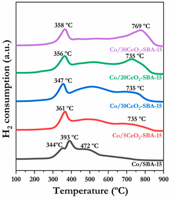 The reducibility was assessed for catalysts produced using H2-TPR analysis, the reducing profiles of which are depicted in Figure 3. In all cases, several reduction features can be distinguished. The Co/SBA-15 catalyst displayed three reduction stages at 344 °C, 393 °C, and 472 °C. The first two are associated with the reduction of Co3+ to Co2+ and afterwards to Co0, while the third one, centered at 472 °C, is related to the existence of Co oxide species with a strong engagement with the SBA-15 support [34]. Cerium-modified catalysts showed a low-temperature reduction peak between 347 °C and 361 °C, which could be described as a simultaneous Co3+ reduction to Co2+ and Co2+ reduction to Co0 [48]. This reduction performance could be correlated with the redox properties of CeO2, which has a well-known oxygen storage and mobilization capacity [26]; this characteristic allowed it to capture and release oxygen easily, generating vacancies in the structure. Incorporating CeO2 into the SBA-15 support facilitates the surface migration and oxygen transfer from cobalt oxides, thus favoring the reduction processes. Furthermore, in these samples, the peak centered at 472 °C shifts toward slightly higher temperatures, suggesting a stronger metal–support interaction (MSI) between the cobalt oxide species and the support. It is associated with the smaller Co crystallite formation, increasing the interfacial contact area, leading to the surface chemical bonding [49]. This highlights the significant role of metal–support interaction in catalyst design since a suitable support will interact effectively with the metallic species, minimizing its surface migration and preventing sinterization. In contrast, scarce metal–support interaction would promote particle agglomeration, leading to a negative impact on the catalytic performance [50]. The Co/10CeO2-SBA-15 catalyst exhibited the most strongly pronounced reduction feature associated with strong metal–support interactions, while this peak was almost absent in the Co/30CeO2-SBA-15 catalyst. It could be attributed to the slight modification of the mesoporous structure. A further decrease in surface area could probably promote CeO2 agglomeration, hindering the effective cobalt oxide species dispersion. Consequently, the metal–support interaction effect between the cobalt phase and the SBA-15 structure was reduced. Additionally, reduction features at higher temperatures (735–769 °C) arise in all Co/xCeO2-SBA-15 catalysts, ascribed to the partial reduction of CeO2 to CeO2−x [25,51]. The reduction degree of Co species was assessed by quantifying the H2 consumption throughout the TPR analysis by comparing the experimental and theoretical H2 uptake (Table 2). The theoretical hydrogen uptake was calculated from the full reduction stoichiometry of the cobalt oxide loading (measured by ICP-OES). Meanwhile, the H2 experimental uptake was obtained by the H2-TPR profiles’ integration of the hydrogen uptake peaks, corresponding to the Co3O4 reduction. All the catalysts exhibited a reduction degree above 95%, with slightly higher values observed for the Ce-doped samples, which is in agreement with the shift in the reduction profile toward lower temperatures for Co species. This slight increase in the reducibility can be attributed to the oxygen vacancy generation caused by the incorporation of ceria [26]. In this respect, the Co/10CeO2-SBA-15 sample reached the highest reduction level, with its experimental uptake, in terms of μmol H2·gcat−1, closely matching the theoretical value.