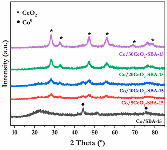 After the catalysts’ reduction step at 600 °C, samples were characterized by XRD analysis, and the resultant diffraction patterns are displayed in Figure 4. As can be discerned, no diffraction peaks corresponding to Co oxides can be distinguished, confirming that the reduction step proceeded successfully. In this sense, peaks arising at 2θ = 44.1 and 76.4° are attributed to the cubic phase of Co0 (JCPDS-15-0806). The Co0 mean crystal sizes in the reduced catalysts were determined based on the principal Co0 diffraction plane (111) using the Scherrer equation (Table 1). Notably, no diffraction features corresponding to Co0 can be observed for Co/20CeO2-SBA-15 and Co/30CeO2-SBA-15 catalysts, which reached a mean crystallite size lower than the detectable limit of the technique. This suggests the metallic phase was widely dispersed on the SBA-15 support modified with 20–30 wt.% of ceria.