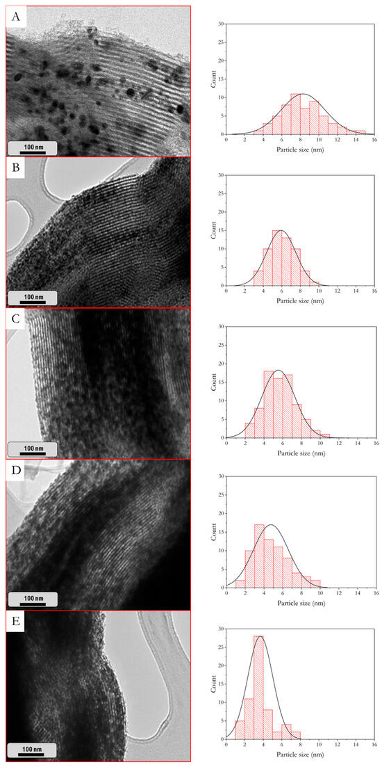 TEM micrographs for the reduced catalysts are presented in Figure 5, in which the well-ordered mesoporous structure typical for SBA-15 can be distinguished, indicating that the mesoporous structure is preserved. This observation aligns with the N2 physisorption results obtained for the calcined samples. In all cases, dark zones can be distinguished on the SBA-15 channels corresponding to Co0 and CeO2 particles, as corroborated by EDX. Furthermore, in the micrograph of Co/SBA-15 (Figure 5A), particles on the external surface of the SBA-15 are clearly distinguishable, suggesting some Co0 particle clustering, as reported before [52]. Moreover, not all of the SBA-15 surface or channels were filled with cobalt particles. On the other hand, in CeO2-doped catalysts (Figure 5B–E), smaller crystallites can be differentiated within SBA-15 channels, corroborating the higher active phase dispersion expected from the mean crystallite sizes shown in Table 1.