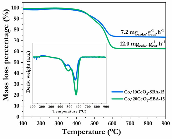 The mass loss profiles together with the thermogravimetric derivative curves of each spent catalyst are displayed in Figure 10. In both samples, the mass percentage started decreasing when the temperature reached around 450 °C, with most of the weight loss in the temperature range 450–600 °C. The coke deposition rate was calculated as 7.2 mgcoke·gcat−1·h−1 for the Co/10CeO2-SBA-15 catalyst and 12.0 mgcoke·gcat−1·h−1 for Co/20CeO2-SBA-15. The DTG profiles display two peaks, a lower-intensity peak centered at 460–480 °C, and a high-amplitude and intensity peak at 550–570 °C. According to the literature, these peaks correspond to the oxidation of deposited carbon nanofilaments with differing ordering degrees. At low temperatures (460–480 °C), filamentous carbon species oxidation took place, which was related to the coke deposition on the metal surface. At higher temperatures (550–570 °C), carbon species were described as aged filamentous carbon, which would be deposited on the catalyst support [51,67]. Coke deposited on the metallic sites would block the active sites directly, affecting the catalytic activity. In contrast, coke deposited on the support would mainly affect the reactants’ diffusion. On both catalysts, the coke deposited on the support (higher temperature peak) was predominant. A higher intensity for Co/20CeO2-SBA-15 was observed, indicating a high carbon total accumulation.