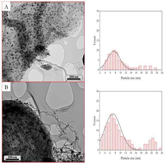 TEM micrographs and particle size distribution histograms of used catalysts at 50 h, 550 °C. (A) Co/10CeO2-SBA15 and (B) Co/20CeO2-SBA15.