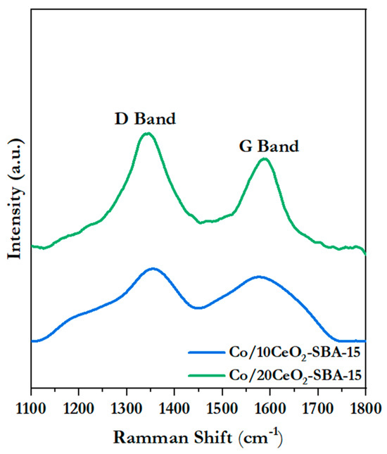 Finally, Figure 12 displays the Raman spectra of the spent catalysts. These spectra exhibit two predominant bands: the D band (~1340 cm−1) and the G band (~1590 cm−1), both attributable to different carbon structures [68,69]. The ratio of these two bands, represented as the ID/IG ratio, has been commonly applied as an indicator of the degree of structural order in the deposited carbon species [68]. In this research, TEM and TGA/DTG analysis demonstrated that the coke was composed mainly of carbonaceous nanostructures, as filaments with different degrees of ordering. Such structures are associated with a higher intensity in the D band [68]; therefore, an increase in the ID/IG ratio could be associated with a greater proportion of them. Accordingly, the Co/20CeO2-SBA-15 catalyst exhibited an ID/IG ratio of 1.4, higher than the 0.8 of Co/10CeO2-SBA-15, suggesting a greater amount of filamentous carbon with a less-ordered structure and, possibly, more tendency for coke accumulation.