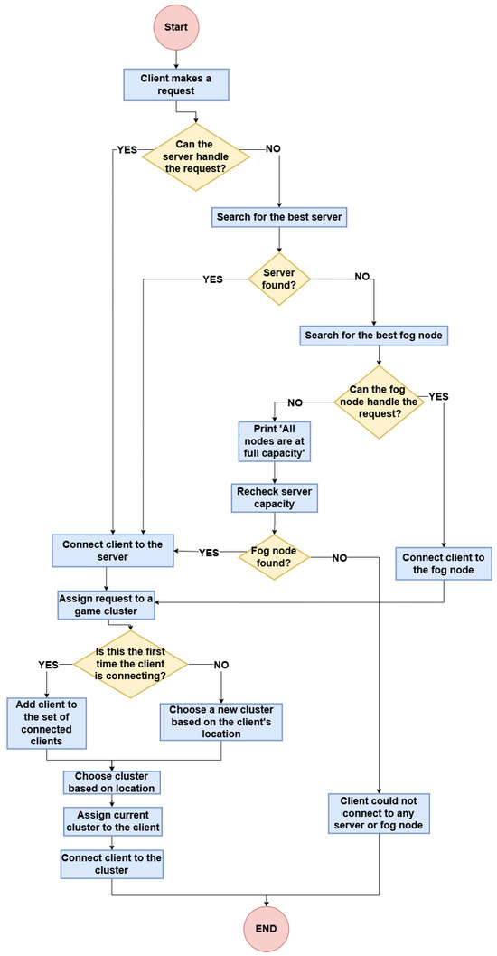 The flowchart presented in Figure 3 describes the load balancing algorithm that manages client requests in an environment that includes cloud servers and fog nodes. When a client makes a request, the system first checks if any cloud server can handle it. If a cloud server is available, the client connects to it. If no suitable cloud server is found, the system searches for the best available fog node to handle the client’s request. If a fog node can handle the request, the client connects to it. If all servers and fog nodes are at full capacity, the system prints a message indicating that there is no available capacity and the client cannot connect. Throughout this process, the system assigns the client’s request to a specific cluster within the selected server or node, calculates latency, and manages the client’s connection.