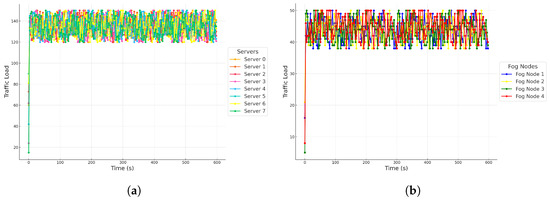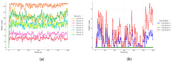 Server and fog nodes load behavior in relation to time in the scenario with more servers and fewer fog nodes.