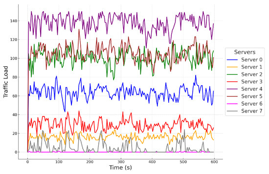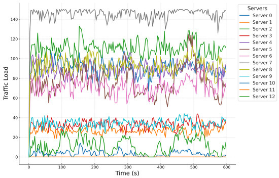 Balanced load distribution: Servers such as 0 (90.64 units), 4 (88.21 units), and 5 (88.65 units) exhibit a balanced and sustained load distribution over time. This suggests that the load balancer is effectively utilizing available resources and maintaining efficient operation without overloading these servers.