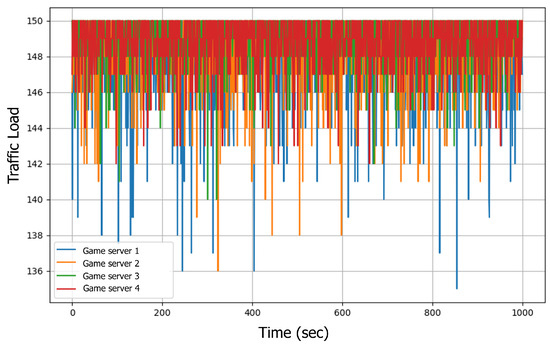 The traffic load of each game server in terms of connected clients as a function of time in seconds.
