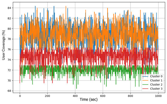 On the other hand, in the proposed model Figure 9, clusters exhibit greater variability in user coverage, with some cases dropping as low as 68%. However, what makes the proposed model more robust is that it shows better control over peaks and variations, maintaining coverage within a broader range (68–85%) but with fewer abrupt drops and more controlled behavior. This suggests that the proposed model adapts better to extreme fluctuations, while the base model, though consistent, does not achieve the same level of adaptability.