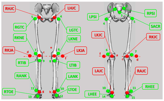 As previously mentioned, the protocol incorporates eight virtual markers. These markers are not physically placed on the participant during motion capture, which enhances participant comfort. They are added during the post-processing phase to define joint centres and axes of rotation. In the present study, virtual markers were employed to define the hip and ankle joint centres, as well as the knee axis of rotation. The hip centre (RHJC and LHJC) was calculated by the functional method SCoRE [29]. The knee rotation axis, which consisted of the knee joint centre (RKJC and LKJC) and an arbitrary point of the knee rotation axis (RKJA and LKJA), was determined from the functional methods SARA [30]. The ankle joint centre (RAJC and LAJC) was determined from the methodology developed by Davis et al. [24]. A table explaining in detail the position of each marker in the PP was included in the Supplementary Materials.