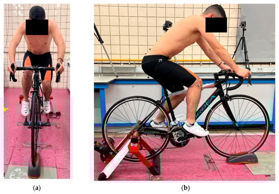 Markers placed on a participant during pedalling. (a) Marker position during pedalling in frontal plane; (b) marker position during pedalling in sagittal plane.