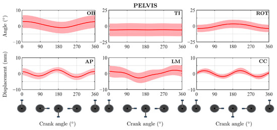 Temporal evolution of the angles and displacements of the pelvis centre of mass for the sagittal, frontal and transverse planes and for the antero–posterior, lateral–medial and cranio–caudal directions during pedalling cycle. Values are shown as the mean ± standard deviation. Abbreviations: TI = Pelvic Tilt. OB = Pelvic Obliquity. ROT = Pelvic Rotation. AP = Antero–Posterior direction. LM = Lateral–Medial direction. CC = Cranio–Caudal direction.
