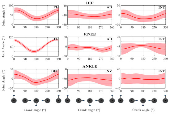 Temporal evolution of the angles of the hip, knee and ankle joint angles for the sagittal, frontal and transverse planes during pedalling cycle. Values are shown as the mean ± standard deviation. Abbreviations: FL = Flexion. AD = Adduction. INT = Internal Rotation. DFL = Dorsiflexion. INV = Inversion.