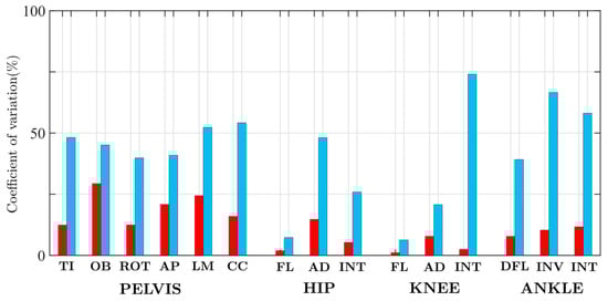 Figure 5 shows the intra- and inter-subject coefficient of variation (CV) [41] of the ROM for the pelvic CoM displacements and rotations and the hip, knee and ankle joint angles during pedalling. To obtain the inter-subject CV, all ranges of each movement analysed for the 19 participants were analysed globally. The intra-subject CV for each ROM was obtained as the average value of the CV of the 19 participants analysed.