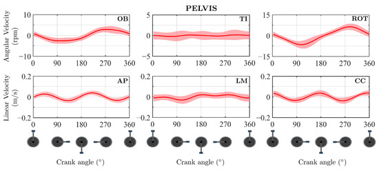 Temporal evolution of the angular and lineal velocity of the pelvis CoM for the sagittal, frontal and transverse planes and for the antero–posterior, lateral–medial and cranio–caudal directions during pedalling cycle. Values are shown as the mean ± standard deviation.