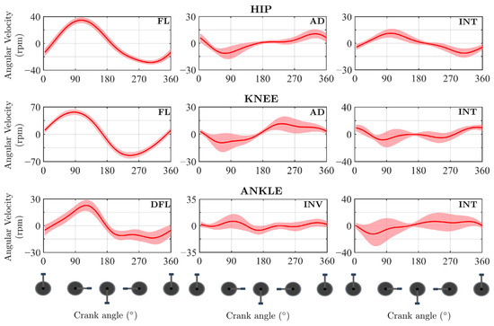 Figure 7 also shows that the maximum hip abduction and internal rotation velocities are in the order of 20–30% of the maximum hip flexion velocity at this joint. In the case of the knee, 10–20%, and in the case of the ankle, the maximum inversion and internal rotation velocities are generally 35–45% lower than the absolute maximum PFL velocities.