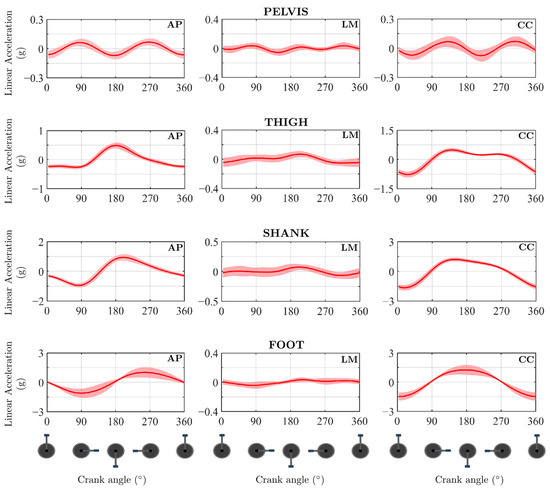 Temporal evolution of the centre of mass linear accelerations of the pelvis, thigh, shank and foot in the three directions of space during a pedalling cycle for each participant studied. Acceleration values are normalised to the value of gravity (9.81 m/s2). The results are shown as the average ± standard deviation.