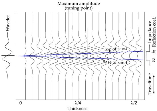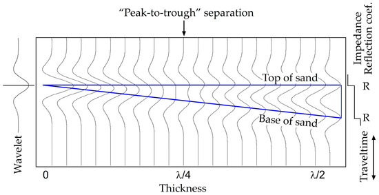 The seismic resolution as defined in a synthetic model that depicts a step-wise impedance profile of a sand wedge surrounded by lower impedance shale above and higher impedance shale below. A zero-phase Ricker wavelet is used. R refers to the reflection coefficient. In this case, Kallweit and Wood’s [16] “peak-to-trough separation” at λ/4 is accepted as a seismic resolvable limit.