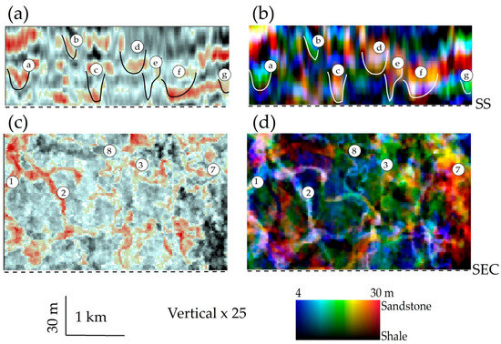 Moreover, avoiding mixing low-frequency components with high-frequency subsets in a display can significantly enhance thin-bed resolution. A better approach is the RGB color blending of high-, moderate-, and low-frequency spectral components or seismic travel time traces, also called frequency fusion [22,47]. Notably, when using 90° data, frequency fusion allows for integrating both thick and thin beds in the vertical view. As a result, the typically constant width of seismic events in conventional stacked and migrated color display (Figure 5a) aligns more accurately with the true thickness of lithofacies’ bodies (in this case, sand bodies a through g, Figure 5b) without substantial interference. In the horizontal view, the broken images of channels in the conventional display (#1–#8, Figure 5c) appear more continuous, revealing more realistic, thickness-adjusted channel geometry (Figure 5d).