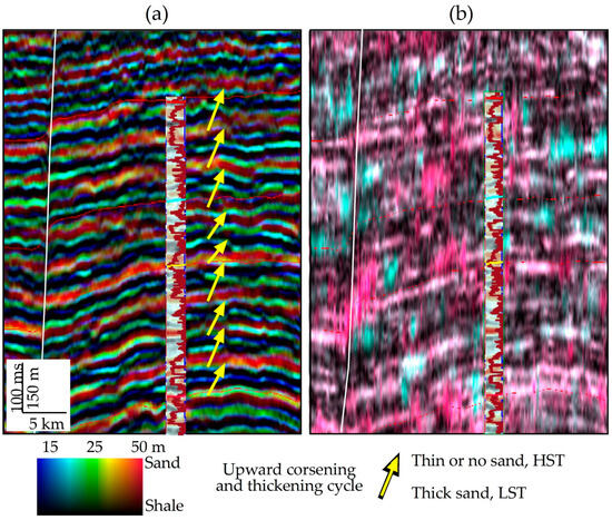 High-resolution stratigraphic imaging and analysis are achieved by fusing three frequencies from a 90° seismic volume. (a) System tracts and sequence stratigraphy influenced sand thickness (ranging from 15 to 50 m in the gamma ray log at the well) and depositional cycles [10]. The left deflection of the log indicates sand. (b) An RGB blending of 14, 30, and 50 Hz iso-frequencies created with MPD is not optimal for stratigraphic imaging. Modified from Zeng [13].
