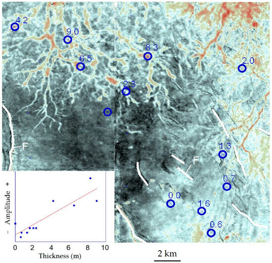 In a case study [12] (Figure 7), a 50 Hz dominant-frequency data set in a lacustrine basin in China is adjusted to a 90° phase, such that the seismic reflection amplitude indicates lithology: positive (red) amplitudes are associated with sandstones, while negative (black) amplitudes indicate shale. Seismic geomorphic patterns of sandstones are ranked by size and thickness and include channels (distributary sands), irregular sheet-like amplitudes between channels (sandy mixtures formed in marginal environments such as crevasse splays), and random patchy amplitudes (residual sands interspersed in shales, probably formed during transgression). The patterns indicate the presence of two shallow-water deltaic systems originating from the basin’s upper-side (northern) margin. Such deltas are typical of lacustrine shallow-water deltas and are characterized by well-developed straight-to-networked distributary channel systems and poorly developed mouth bars and sand sheets at the delta front. In wells, the thickness of the sandstone in this delta varies from about 0.5 (prodelta) to 10 m (delta plain). It is confirmed with wireline-log verification that distributary channel sands as thin as one meter (λ/80) can be spatially resolved (Figure 7)—much thinner than the λ/25 speculated by Sheriff [49] decades ago.
