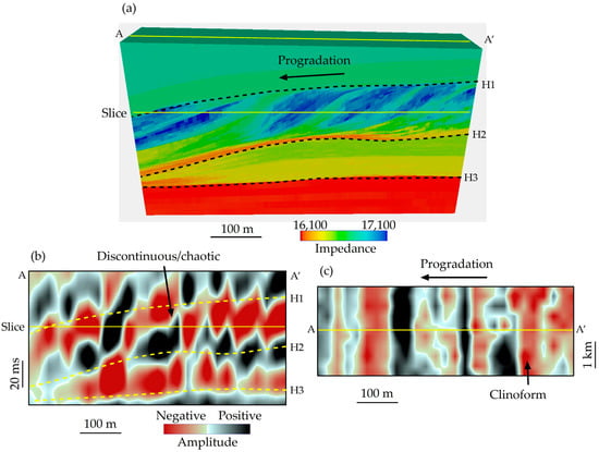 Figure 8. Thin progradational clinoforms show a discontinuous–chaotic vertical pattern but a clear parallel horizontal pattern. (a) A 3D impedance model of an outcrop-based, 50 ms (150 m) thick, progradational sequence. (b) A vertical synthetic seismic section of a 28 Hz wavelet illustrates mostly discontinuous to chaotic reflections. (c) A horizontal amplitude slice showing a parallel pattern perpendicular to the progradation direction. Modified from Zeng et al. [23].